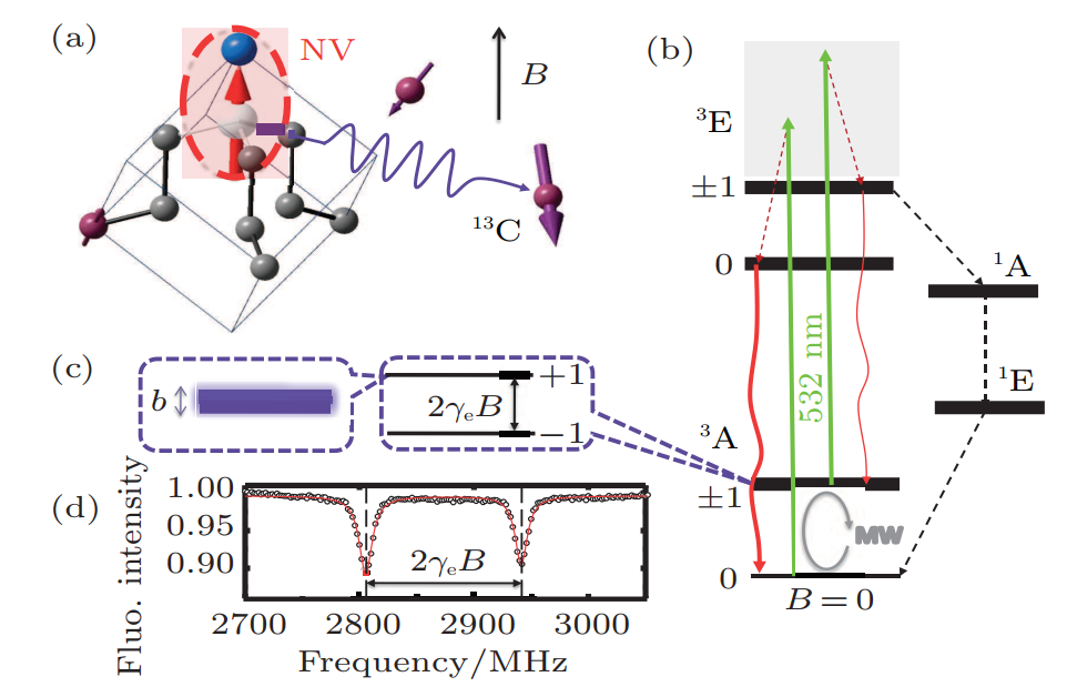 NV色心是金剛石中的一種發(fā)光點(diǎn)缺陷。一個(gè)氮原子取代金剛石中的碳原子,并且在臨近位有一個(gè)空位,這樣的點(diǎn)缺陷被稱為NV色心。由于NV的熒光非常穩(wěn)定,是一種良好的單光子源,被用于量子密鑰分配、生物熒光標(biāo)記等實(shí)驗(yàn)。NV色心的自旋可通過(guò)激光和微波實(shí)現(xiàn)操作和探測(cè)。另外由于NV的電子自旋相干時(shí)間可達(dá)毫秒量級(jí),它被認(rèn)為是一種十分具有潛力的量子計(jì)算機(jī)系統(tǒng)。利用NV的量子寄存器、量子糾錯(cuò)等實(shí)驗(yàn)被驗(yàn)證。同時(shí)NV也可作為納米尺寸的傳感器,用于磁場(chǎng)、電場(chǎng)、溫度等物理量的測(cè)量。得益于金剛石的光學(xué)微納加工工藝的日益完善,以金剛石為基礎(chǔ)的集成光學(xué)在NV色心的幫助下也正快速的發(fā)展著。而以化學(xué)氣相沉積制備的金剛石樣品的品質(zhì)越來(lái)越高,加之NV色心可通過(guò)離子束注入的靈活性,NV色心在將來(lái)必將得到越來(lái)越廣泛的應(yīng)用與關(guān)注。