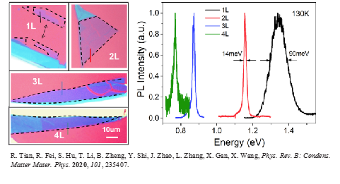 體相黑磷具有直接帶隙(0.3 eV),隨著層數(shù)減少,帶隙逐漸增大,單層帶隙寬度可達(dá)1.7 eV,且少層黑磷和體相黑磷帶隙隨溫度呈現(xiàn)不同溫度依賴關(guān)系。